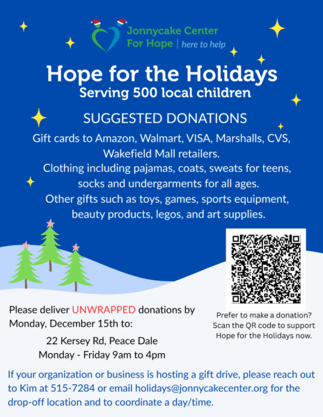 Drop off your donation by December 15th to our location at 22 Kersey Road in Peace Dale. Drop-off hours are Monday through Friday from 9:00 am to 4:00 pm.