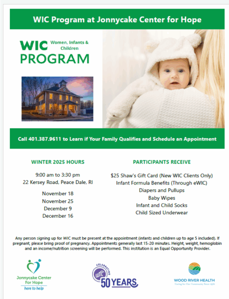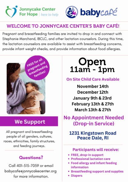 Introducing Jonnycake Center’s Baby Café, the newest initiative to provide nutrition support and education in our community. The Baby Café provides services for pregnant and breastfeeding families including lactation support, weight and height checks, infant care supplies, and more. This program is free and open to the public, walk-ins welcome!