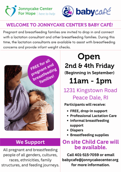 Introducing Jonnycake Center’s Baby Café, the newest initiative to provide nutrition support and education in our community. The Baby Café provides services for pregnant and breastfeeding families including lactation support, weight and height checks, infant care supplies, and more. This program is free and open to the public, walk-ins welcome!